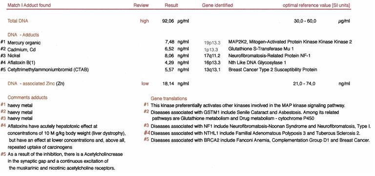 Unten ist eine DNA-Analyse meiner Frau mit den in/an der DNA vorgefundenen Giften aufgeführt.