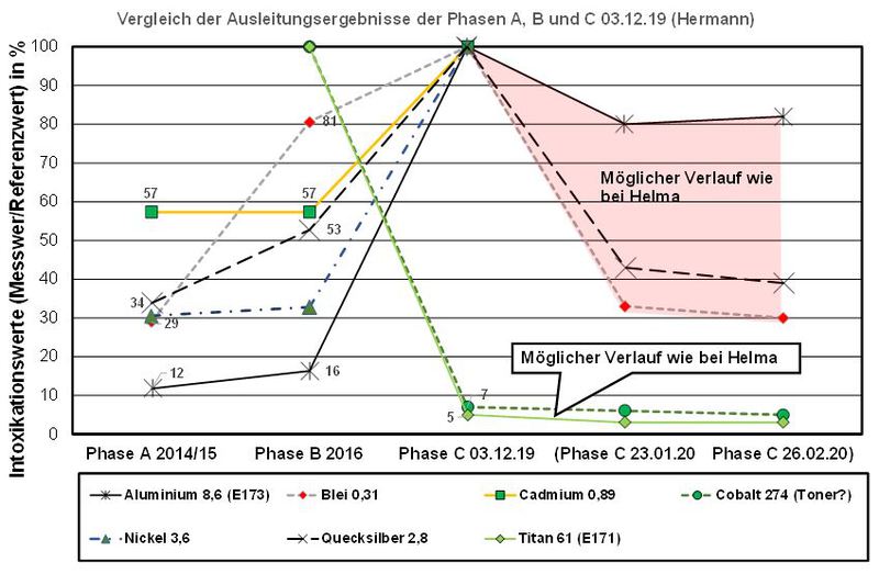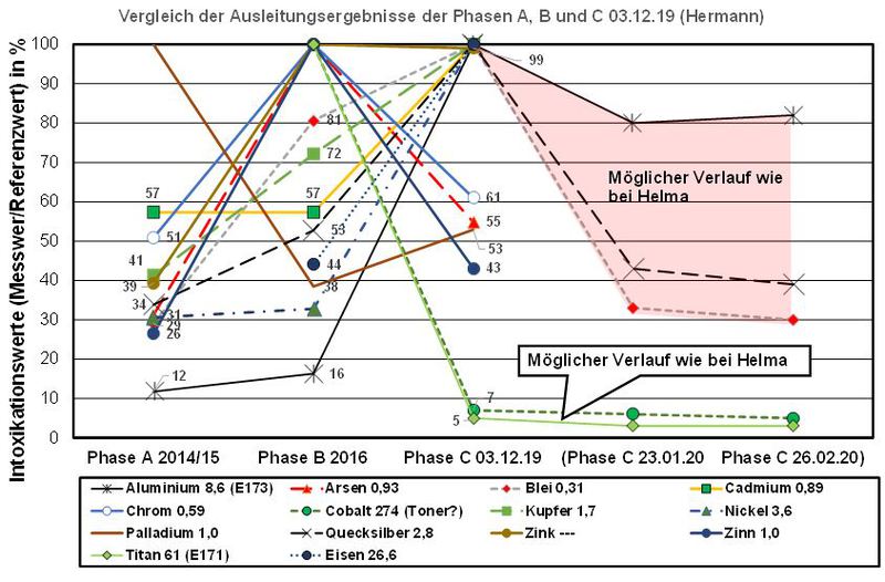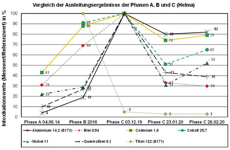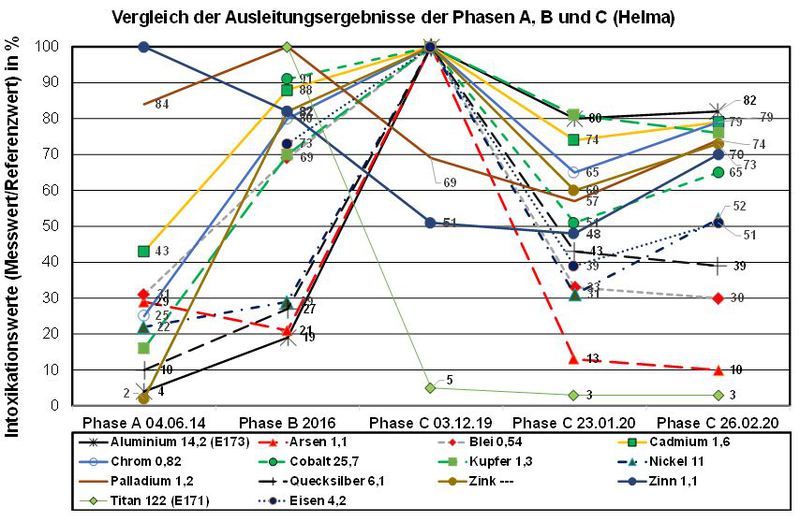 Es wurden 14 Metalle dargestellt. In der Chelat-Therapie betrug die Anzahl der Sitzungen 45 Stück mit insgesamt 9 Provokationen. Am 01.02.16 erfolgte die erste Provokation bei Helma mit Nullmessung vor der Provokation. Da die Nullmessung nicht unerhebliche Messwerte zeigte, wurden sie ebenfalls in der Auswertung berücksichtigt. Somit sind jeweils 2 Messwerte für den 01.12.19 vorhanden. Die Behandlungsdauer betrug 9 Monate in der Phase B und ca. 3 Monate in der Phase C. Eine Nullmessung bei Helma am 04.06.2014 steht stellvertretend für Phase A.